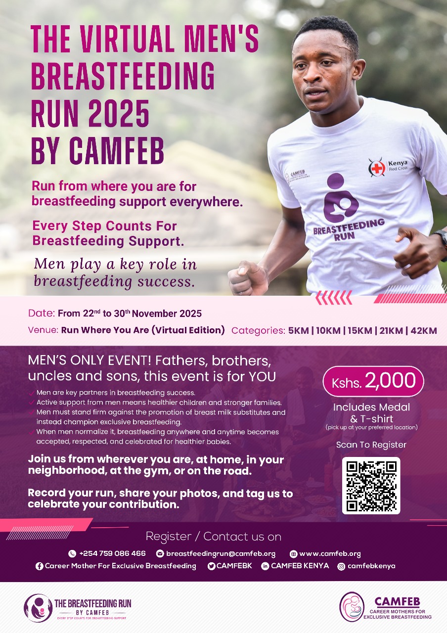 The Men’s Breastfeeding Run 2025 (Men’s Edition by CAMFEB) will be held on Saturday, 22 November 2025 at the Waterfront Mall, Karen (Nairobi). This all-male road race, timed just after International Men’s Day, will feature 5 km, 10 km, and 21 km races. About 500 men (fathers, brothers, uncles, and other male caregivers) will be mobilized as champions of exclusive breastfeeding. CAMFEB will use this event to highlight that men are key partners in breastfeeding success: their active support leads to healthier children and stronger families. Through the run, participants will be encouraged to stand firm against aggressive marketing of breast-milk substitutes and to normalize breastfeeding as a shared responsibility. By “taking every step” in solidarity, men will help ensure that breastfeeding is accepted, respected, and celebrated everywhere.